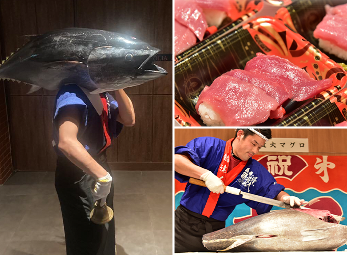 「近大マグロの解体ショー」を行います! 解体後はお寿司、お刺身として召し上がっていただきます。 ぜひ迫力ある解体ショーと近大マグロの美味しさを体験してください!